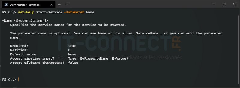 On remarque que la commande Start-Service dispose d'un paramètre nommé -Name. Si l'on veut en savoir plus sur ce paramètre, on peut consulter l'aide de cette façon :
