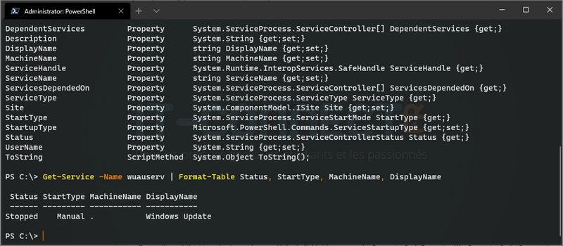 Enfin, pour obtenir l'état d'un statut spécifique, par exemple le service "Windows Update" (qui a pour nom wuauserv), on pourra le cibler directement :