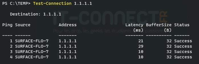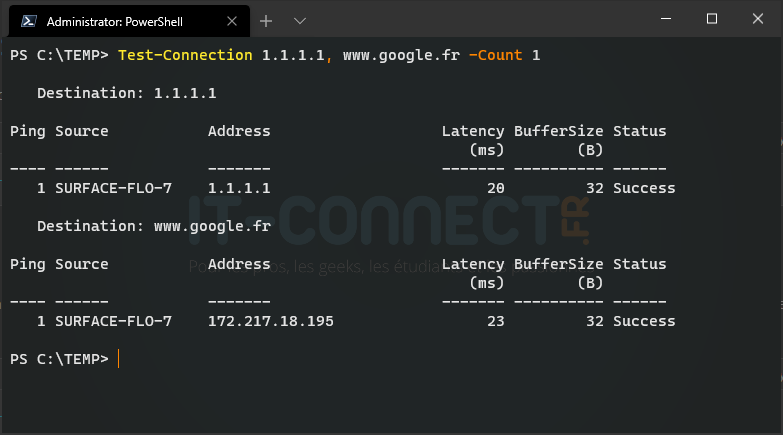 Test-Connection 1.1.1.1, www.google.fr -Count 1