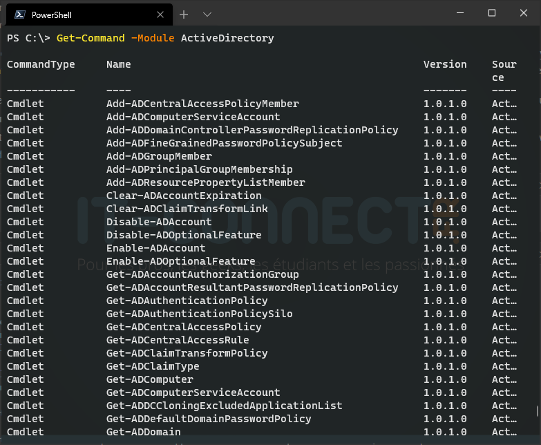 Enfin, on peut obtenir la liste de toutes les commandes d'un module spécifique. Par exemple, toutes les commandes du module Active Directory :