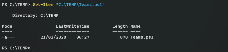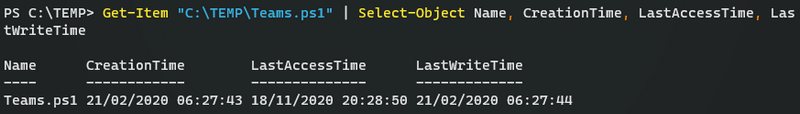 Get-Item "C:\TEMP\Teams.ps1" | Select-Object Name, CreationTime, LastAccessTime, LastWriteTime