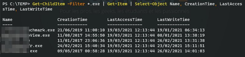 Get-Item *.exe | Select-Object Name, CreationTime, LastAccessTime, LastWriteTime
