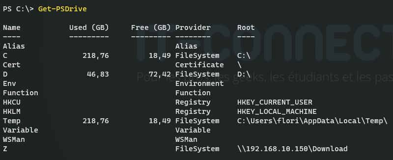 La commande Get-PSDrive permet de récupérer des informations sur les différents lecteurs du système. Plusieurs types de lecteurs différents sont remontés par cette commande, et il y en a deux particulièrement utiles :
