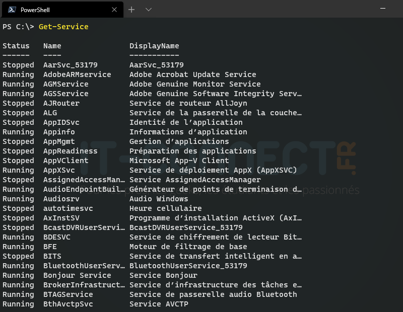 Sans paramètre, la commande va renvoyer tous les services avec plusieurs informations : le statut, le nom du service et son nom d'affichage (tel qu'il est dans la console de gestion des services).