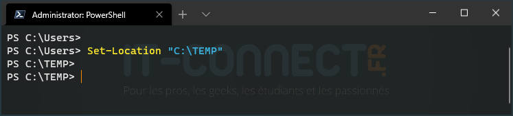 Utile pour l'usage de la console PowerShell plus que pour les scripts directement, la commande Set-Location est indispensable, car elle permet de se déplacer d'un dossier à un autre. Autrement dit, elle correspond à la fameuse commande "cd" (Change Directory) que l'on retrouve aussi sous Linux.
