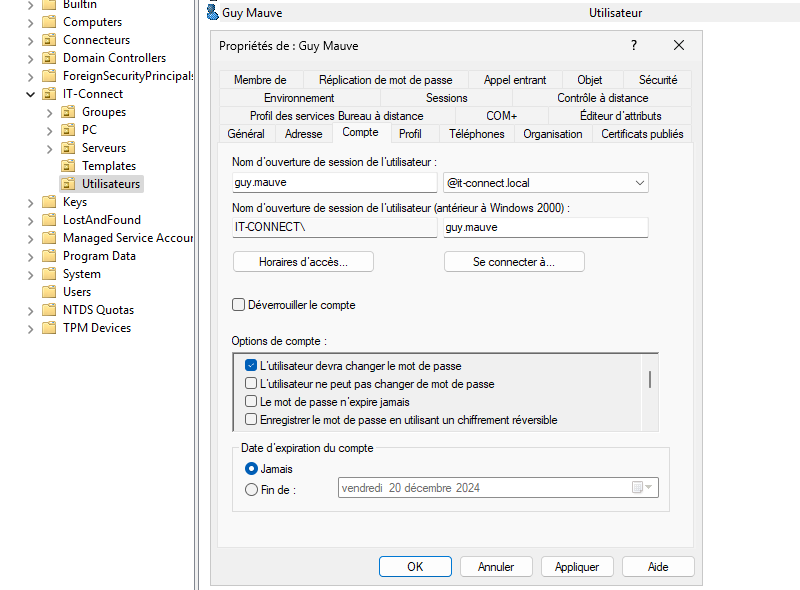 Notre contexte : l'entreprise IT-Connect accueille un nouveau salarié nommé "Guy Mauve", dont l'identifiant sera "guy.mauve". Nous devons créer un nouvel utilisateur dans l'Active Directory pour cette personne et définir un mot de passe.