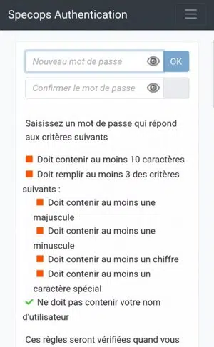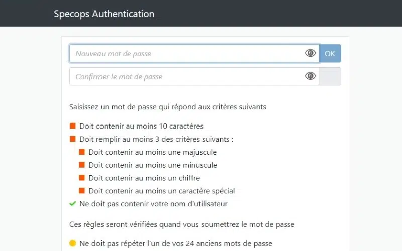 Quand c'est fait, l'utilisateur pourra alors créer son mot de passe, toujours en respectant la stratégie de mots de passe.