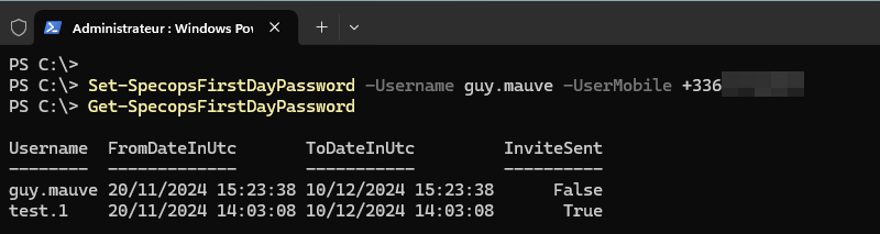 Set-SpecopsFirstDayPassword -Username guy.mauve -UserMobile +336XXXXXXXX