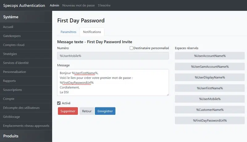 Mais avant cela, vous devez créer un modèle de notifications pour les SMS et/ou les e-mails. Il est possible de définir des modèles distincts pour les notifications initiales et aussi pour les messages de confirmation (facultatif). Comme le montre l'exemple ci-dessous, un système de variables permet de personnaliser le contenu des messages, et ainsi d'intégrer le nom de l'utilisateur (récupéré depuis l'AD).