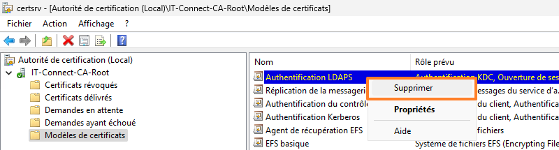 Du côté du serveur ADCS, vous pouvez retirer le modèle correspondant au LDAPS de la liste des modèles publiés, puisque nous n'en aurons plus besoin. Ceci évite qu'il soit accessible à un tiers non autorisé (en cas de mauvaise gestion des permissions) : il vous suffira de le republier pour les phrases de renouvellement (via le menu "Nouveau" puis "Modèle de certificat à délivrer" tel que nous l'avons fait précédemment).