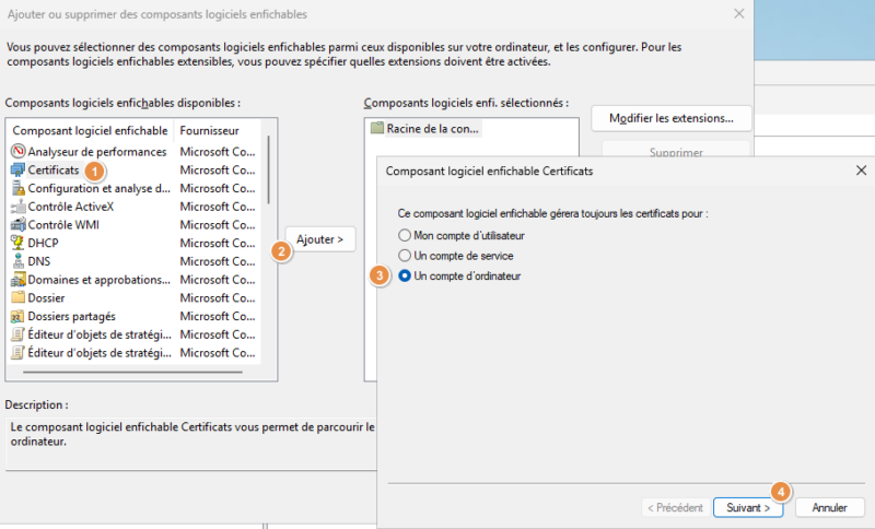 Sélectionnez le composant nommé "Certificats" et cliquez sur le bouton "Ajouter". Dans la fenêtre qui apparaît, choisissez l'option "Un compte d'ordinateur" et poursuivez jusqu'à la fin (conservez l'ordinateur local).