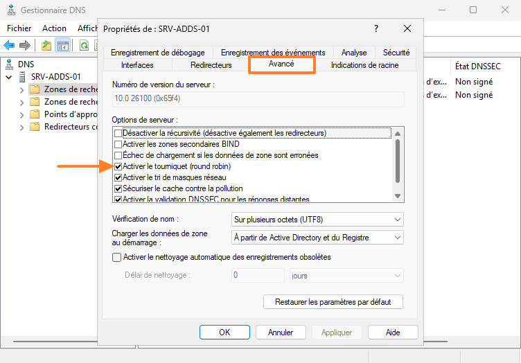 Commencez par ouvrir la console "Gestionnaire DNS" sur le serveur, puis accédez aux propriétés du serveur DNS. Dans l'onglet "Avancé", vérifiez que l'option "Activer le tourniquet (round robin)" est cochée. En principe, c'est le cas avec la configuration par défaut.