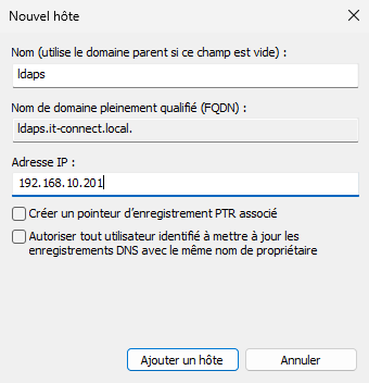 Voici les deux enregistrements créés pour "ldaps.it-connect.local"en spécifiant les adresses IP des contrôleurs de domaine :