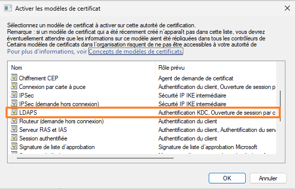 Dans la liste, sélectionnez le modèle "LDAPS" et validez. S'il n'apparaît pas dans la liste, patientez jusqu'à la prochaine synchronisation Active Directory et réessayez. Vous pouvez aussi forcer la synchronisation AD avec repadmin.