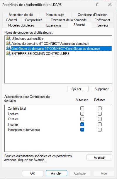 Pour finir, cliquez sur l'onglet "Sécurité" pour limiter l'accès à ce modèle de certificat. Supprimez les permissions inutiles. Il est surtout essentiel de conserver les permissions pour les "Contrôleurs de domaine" (inscription) ainsi que pour les "Utilisateurs authentifiés" (en lecture seule). Pour affiner les permissions, vous pouvez supprimer "Utilisateurs authentifiés" et ajouter à la place le compte ordinateur correspondant au serveur hébergeant l'autorité de certification.