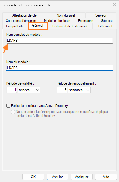 Nous allons personnaliser notre nouveau modèle. Commencez par l'onglet "Général". Nommez ce modèle, par exemple "LDAPS".