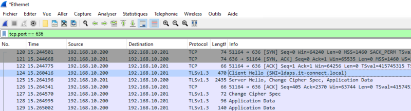 Si nous capturons les échanges entre le DC et le serveur client, avec une application telle que Wireshark, nous pouvons voir que les échanges LDAP sont chiffrés à l'aide de TLS.