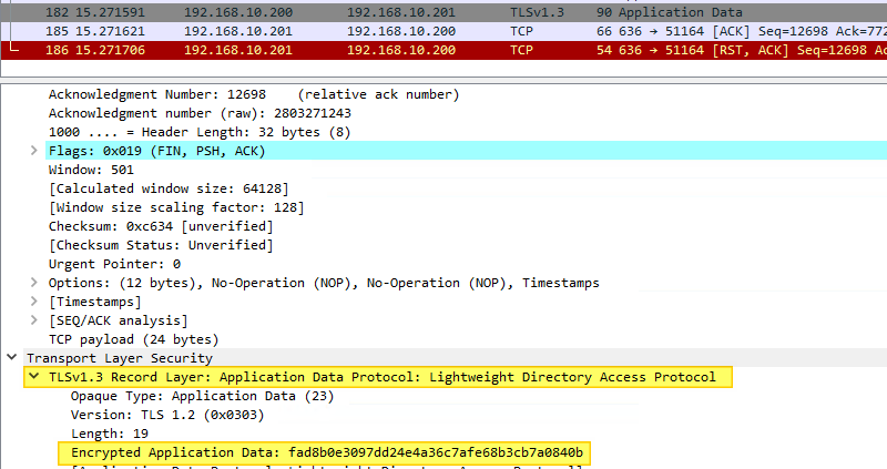 Si nous regardons de plus près l'un des paquets, nous pouvons voir qu'il s'agit de données applicatives "LDAP" et qu'elles sont chiffrées. Ainsi, nous ne pouvons pas lire le contenu. En temps normal, avec le LDAP, nous aurions pu voir en clair le contenu des échanges.