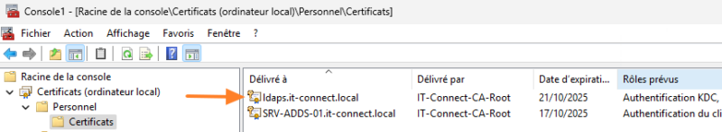 Le certificat LDAPS est bien présent dans le magasin des certificats du DC :