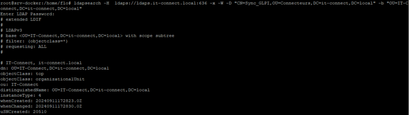 ldapsearch -H ldaps://ldaps.it-connect.local:636 -x -W -D "CN=Sync_GLPI,OU=Connecteurs,DC=it-connect,DC=local" -b "OU=IT-Connect,DC=it-connect,DC=local"