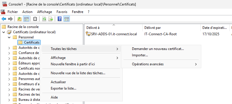 Une fois que la console est ouverte, accédez à "Personnel" puis effectuez un clic droit sur "Certificats". À partir du menu "Toutes les tâches", cliquez sur "Demander un nouveau certificat".