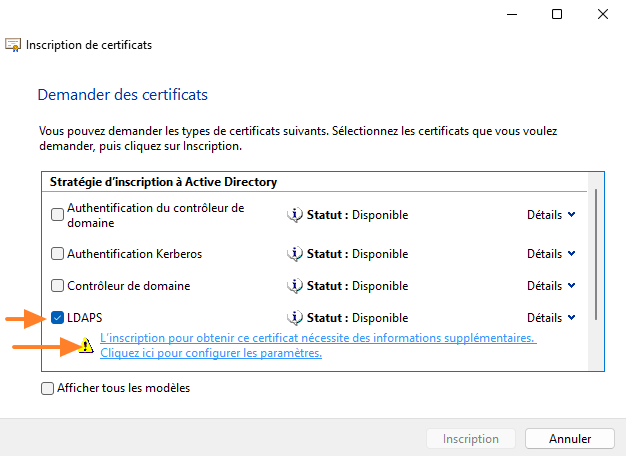 L'assistant va lister les modèles de certificats disponibles. Cochez "LDAPS" et cliquez sur le lien "L'inscription pour obtenir...". Cette option est disponible, car nous avons activé l'option "Fournir dans la demande" pour le nom du sujet. Si les permissions sur le modèle ne sont pas assez restrictives, un attaquant pourrait accéder à ce modèle pour obtenir un certificat pour le nom de son choix.