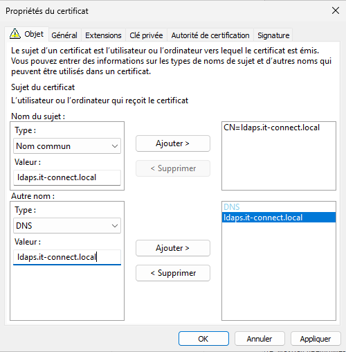 Dans la fenêtre qui apparaît, commencez par ajouter "ldaps.it-connect.local" en tant que "Nom commun" et "DNS". Comme ceci :