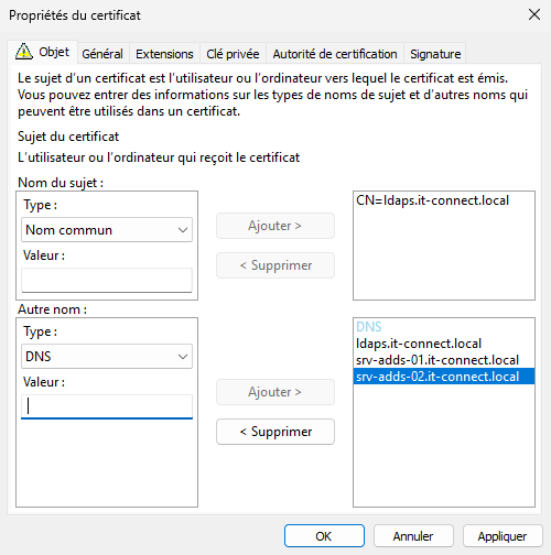 - Si la connexion LDAPS initiée sur le nom « it-connect.local » renvoie sur le serveur « SRV-ADDS-02 », qui est l’autre DC, non renseigné dans le certificat, ça ne passe pas.