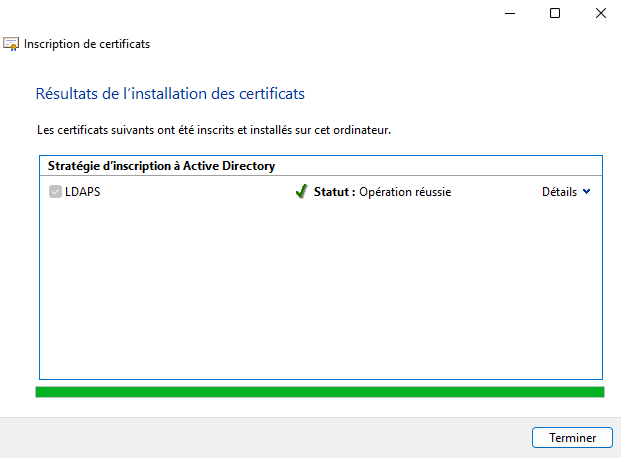 Poursuivez jusqu'à la fin... Voilà, le certificat LDAPS est désormais présent dans le magasin des certificats de mes 2 contrôleurs de domaine.