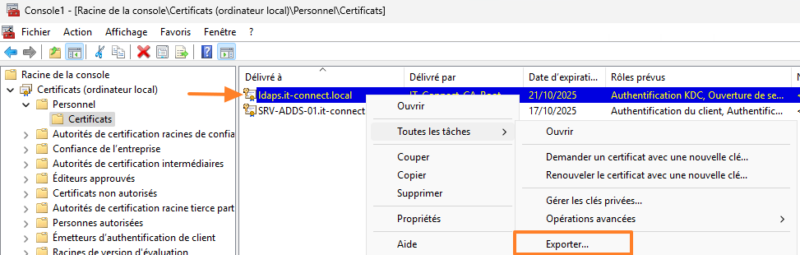 Une fois que le certificat sera généré, il sera nécessaire de l'exporter puis de l'importer sur tous les contrôleurs de domaine. Cette méthode implique de déclarer tous les DC en tant que nom DNS dans le certificat, au moment de faire la demande de certificat, sinon la connexion est refusée.