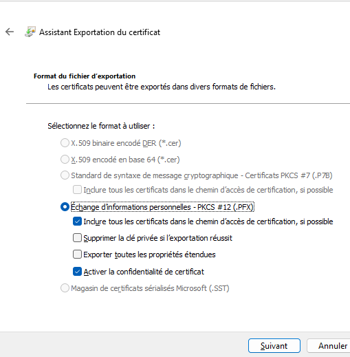 Le format de sortie est "PFX" puisque nous avons pris la décision d'inclure la clé privée au fichier de sortie.