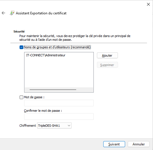 Je vous encourage à protéger ce certificat avec nom d'utilisateur ou un groupe de sécurité, ou à minima avec un mot de passe. Ceci évite que n'importe qui puisse le lire et l'importer.