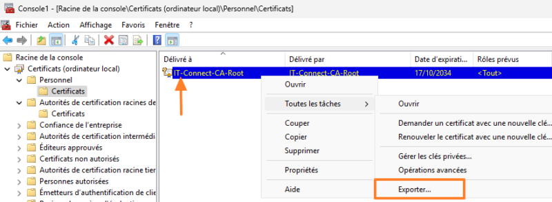 Effectuez un clic droit sur le certificat, puis sous "Toutes les tâches", choisissez l'option "Exporter...".