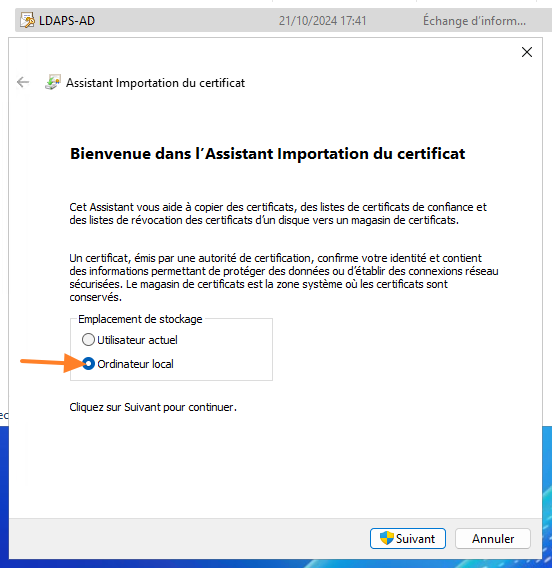 Copiez-collez le fichier "LDAPS-AD.pfx" sur les autres DC et importez-le. Ici, nous utilisons la méthode manuelle, mais il est possible de s'appuyer sur PowerShell pour gagner du temps. Double-cliquez sur le fichier, puis choisissez "Ordinateur actuel" avant de continuer.