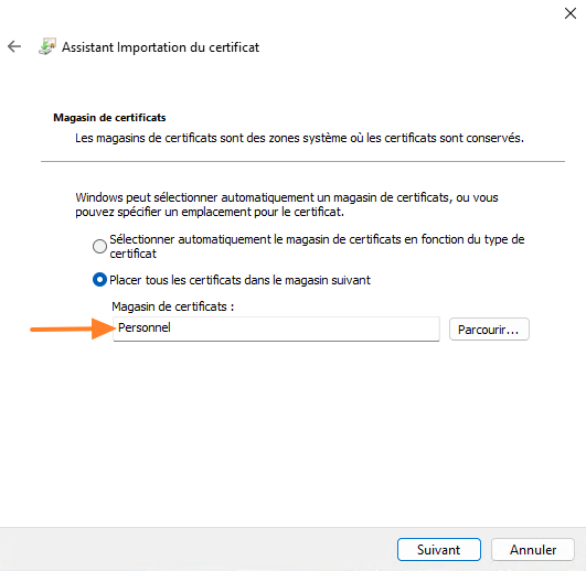Passez les premières étapes en conservant les choix par défaut. Veillez à placer le certificat dans le magasin "Personnel" en cliquant sur le bouton "Parcourir".