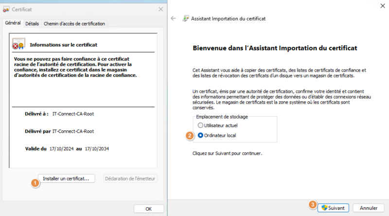 Sur Windows, vous devez également importer le certificat de l'autorité de certification (sauf s'il s'agit d'une machine intégrée au domaine AD). Dans ce cas, transférez sur la machine le fichier "Cert-IT-Connect-CA-Root.cer" et double-cliquez dessus.