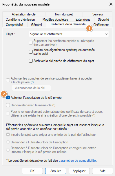 Basculez dans l'onglet "Traitement de la demande" afin de cocher l'option "Autoriser l'exportation de la clé privée". Ceci est nécessaire dans le but de pouvoir exporter le certificat au format PFX (il permet d'inclure la clé privée) et de l'importer ensuite sur les autres DC.