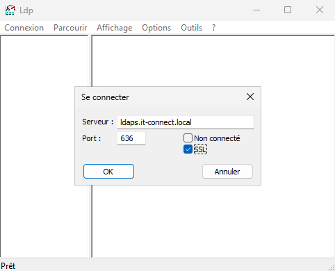Indiquez "ldaps.it-connect.local" en tant que serveur, spécifiez le numéro de port "636" et cochez la case "SSL". Cliquez sur "OK" pour tenter une connexion.