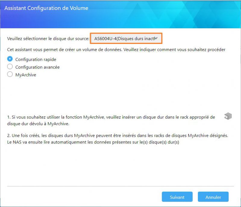 Au niveau du disque dur source, sélectionnez l'unité d'expansion, par exemple "AS6004U-4". Choisissez ensuite le mode de configuration qui vous semble le plus adapté. Si vous souhaitez choisir vous-même un type de RAID, prenez "Configuration avancée".