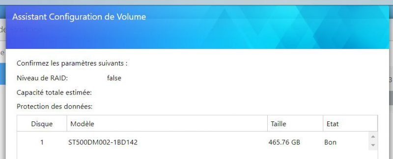 Continuez jusqu'à l'étape de validation finale, pour ma part j'ai sélectionné un seul disque donc il n'y a pas de RAID, mais un volume simple.
