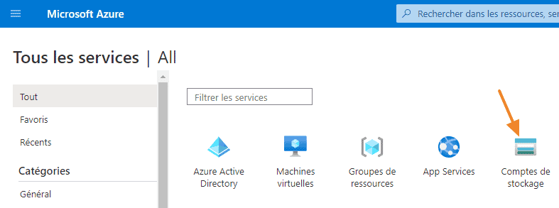 Pour accéder à la fonctionnalité "Partage de fichiers" d'Azure, il est nécessaire de disposer d'un compte de stockage. À partir du portail Azure, il faut rechercher le service "Comptes de stockage" pour créer un compte.