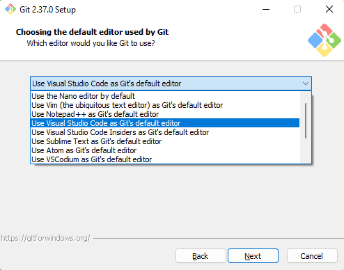 L'installation prend un peu de temps si l'on s'intéresse aux différentes options. Ces choix sont modifiables ultérieurement, et vous pouvez vous contenter de laisser les valeurs par défaut. Par exemple, Git offre la possibilité de définir un éditeur de code par défaut lorsque vous ouvrez un fichier de votre projet via Git.