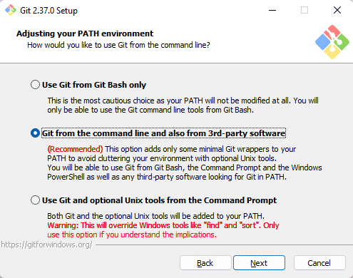 Quand on installe Git, il est livré avec Git Bash c'est-à-dire une console permettant d'utiliser Git. Néanmoins, on peut aussi l'utiliser au travers des autres consoles, notamment PowerShell et d'outils tiers, ce qui est recommandé. De ce fait, il faut bien ajuster la variable d'environnement PATH en choisissant "Git from the command line and also from 3rd-party software".
