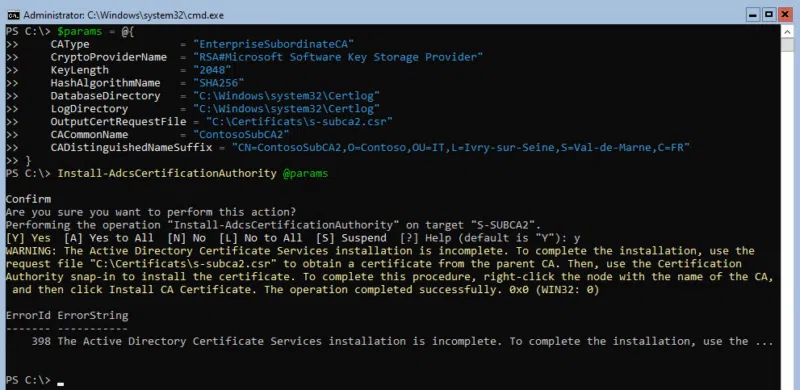 Ensuite, nous pouvons exécuter la commande PowerShell qui procèdera à la configuration initiale de l'autorité :