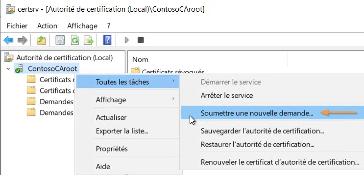 Une fois le fichier de demande copié sur l'autorité racine, il est possible de demander le certificat. Depuis la console de gestion de l'autorité, opérez un clic-droit sur le nom de l'autorité, et à la rubrique "Toutes les tâches" vous trouverez l'option "Soumettre une nouvelle demande…"