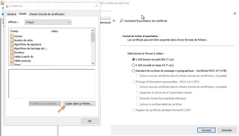 Cette fois, c'est depuis la rubrique « Certificats délivrés » que l'on retrouvera notre tout nouveau certificat et il nous faut l'exporter afin de l'installer sur l'autorité secondaire. Opérez un double-clic sur l'entrée du certificat dans la liste de la vue "Certificats délivrés", puis dans l'onglet "Détails", cliquez sur le bouton "Copier dans un fichier". Le fichier généré devra être copié sur le serveur d'autorité intermédiaire.