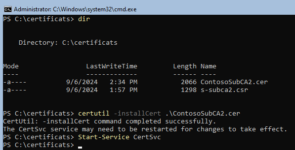 copy C:\Windows\system32\CertSrv\CertEnroll\S-SUBCA2.contoso.ad_ContosoSubCA2.crt '\\S-SERVICESCA\c$\inetpub\wwwroot\'