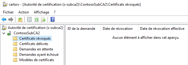 En lançant la console de gestion d'autorité depuis une autre machine, par exemple « S-SUBCA1 » et en ciblant le serveur « S-SUBCA2 », vous obtiendrez un affichage de ce type, confirmant que l'autorité est opérationnelle :
