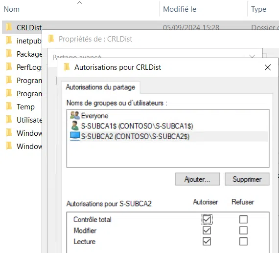 Sur le partage « CRLDist » de « S-SERVICESCA », il faut ajouter l'autorisation pour le serveur « S-SUBCA2 » d'écrire.