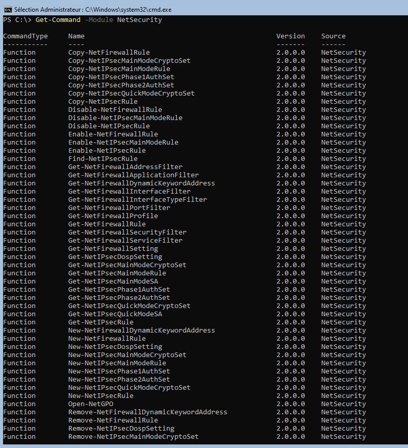 Avec la commande suivante, vous pouvez lister l'ensemble des cmdlets du module NetSecurity :